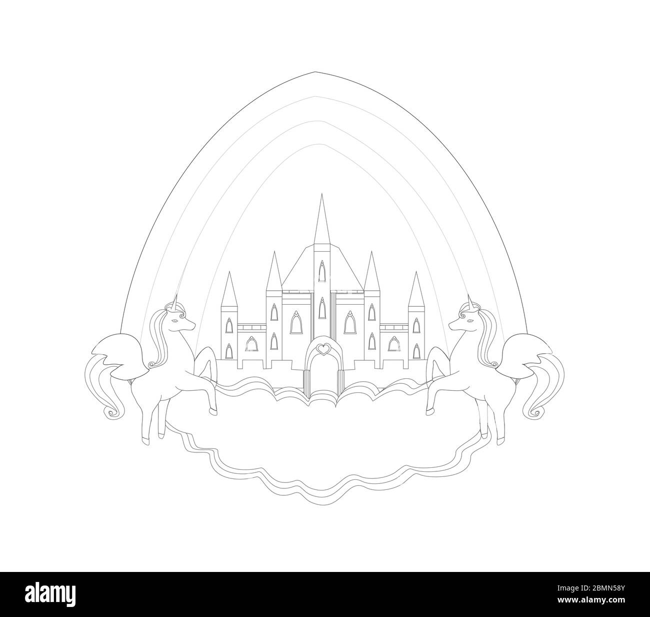 Fairytale Castle Frame And Flying Unicorns Coloring Book Stock