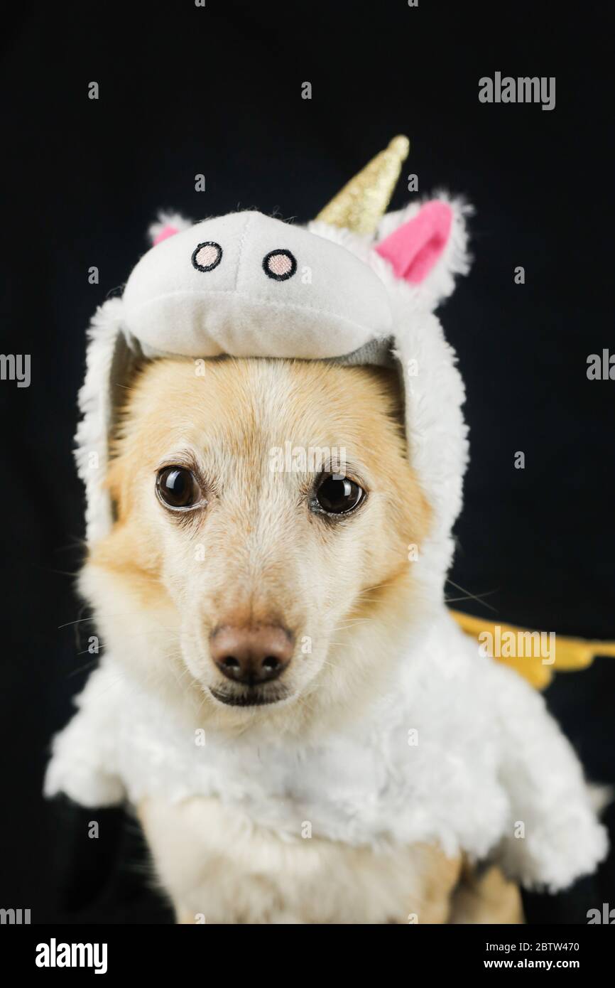 Cute Dog Breed Welsh Corgi In A Unicorn Costume With Horn And