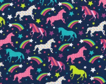 100 Cotton Fabric Unicorn Rainbow Flower Pink Navy Kids Childrens