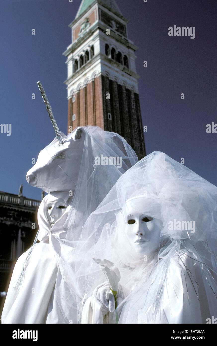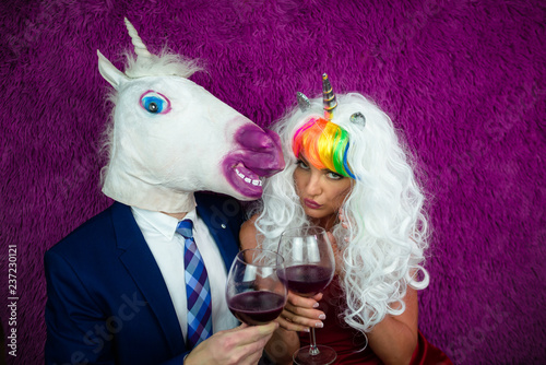 Portrait Of Freaky Couple On Purple Background Strange Young Woman In Unusual Wig Drinking Wine With Man In Mask And Suit Unicorn With Girlfriend Buy This Stock Photo And Explore Similar