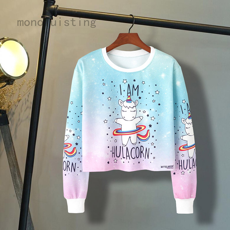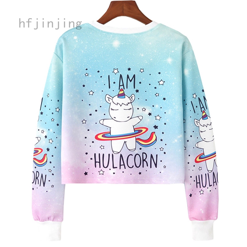 2019 Womens Long Sleeve Hoodies Sweatshirts Pullover Unicorn Crop