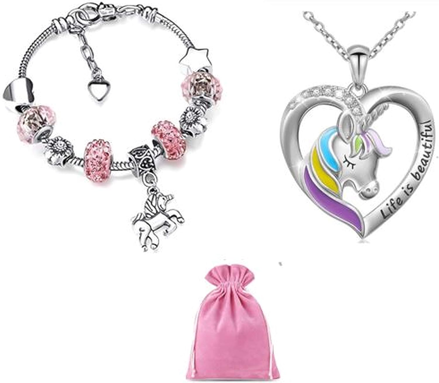 Unicorn Crystal Charm Bracelet And Heart Unicorn Necklace With A