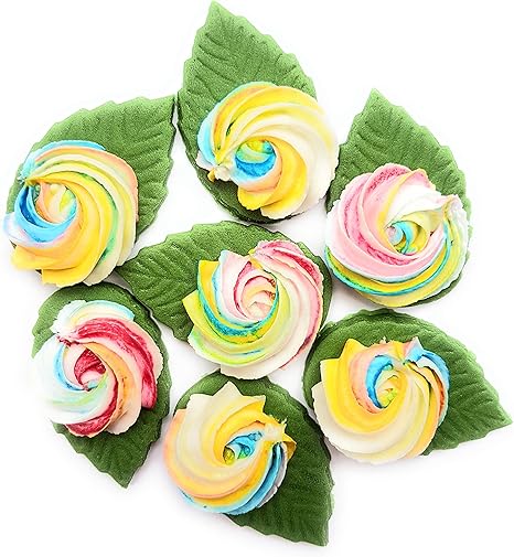 6 Rainbow Rose Swirls On Leaves 4 5cm Edible Sugar Cake