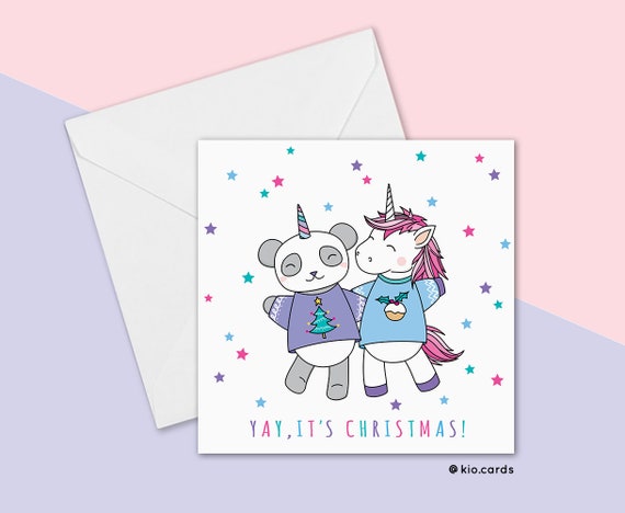 Panda And Unicorn Christmas Card Kawaii Christmas Cute Etsy