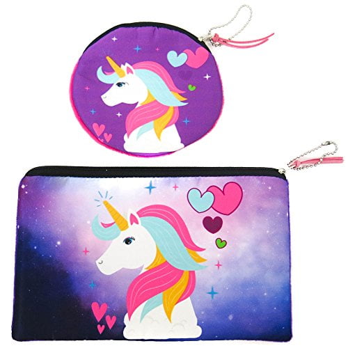 Frogsac Unicorn Makeup Bag Pencil Case Pouch Coin Purse For Women Girls Teens Kids Tween 2 Pcs Set Portable Cosmetic Multi Functional Travel Toiletry Zipper Handbag With Round Cute Wallet Purple