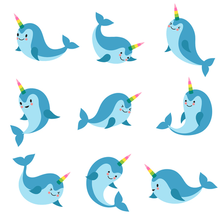 Cute Baby Narwhal Unicorn Set Vector Cartoon Character Of Magic