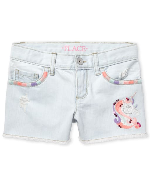 Girls Embroidered Unicorn Frayed Hem Distressed Denim Shortie Shorts