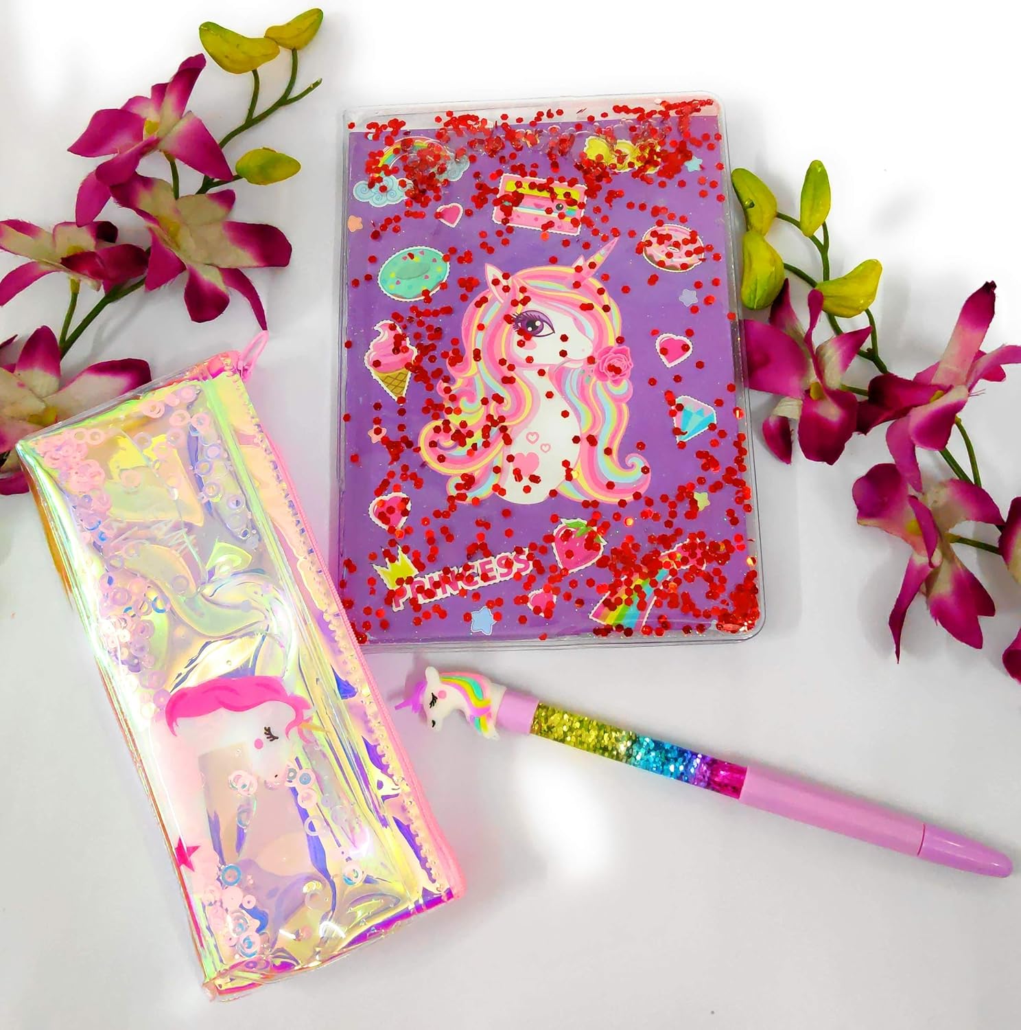 Tera13 Pack Of 3 Unicorn Glitter Diary With Glitter Pen Pouch
