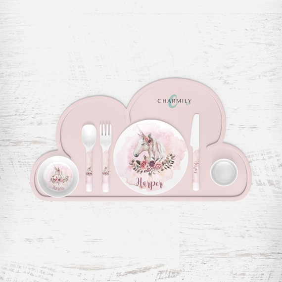 Childrens Melamine Dinner Set Bowl Plate Cutlery Unicorn Girls