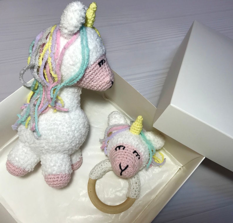 Set Crochet Unicorn Toy Rattle Baptism Present Super Soft Fleece