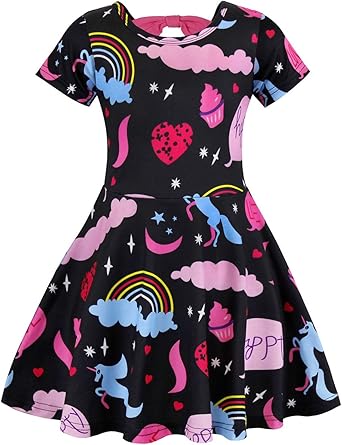 Alaming Children Girls Unicorn Dress Kids Short Sleeve Party