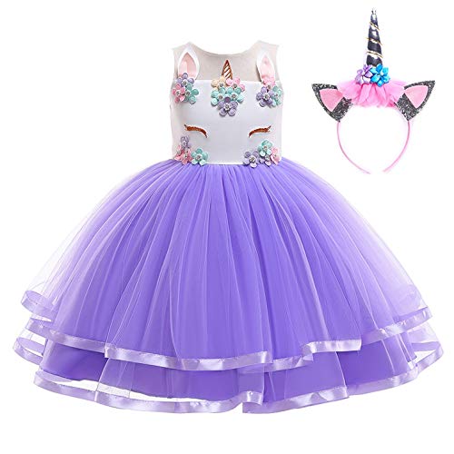 Girls Unicorn Dress Costume Flower Princess Dress With Headband