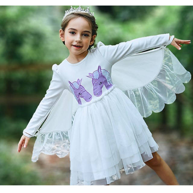 Girls Dress Angel Wings Unicorn Embroidery Cotton Princess Dress