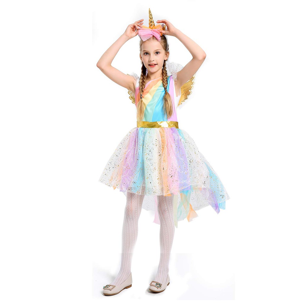 New Girl Rainbow Unicorn Dressing Up Outfit Gold Headband Wings
