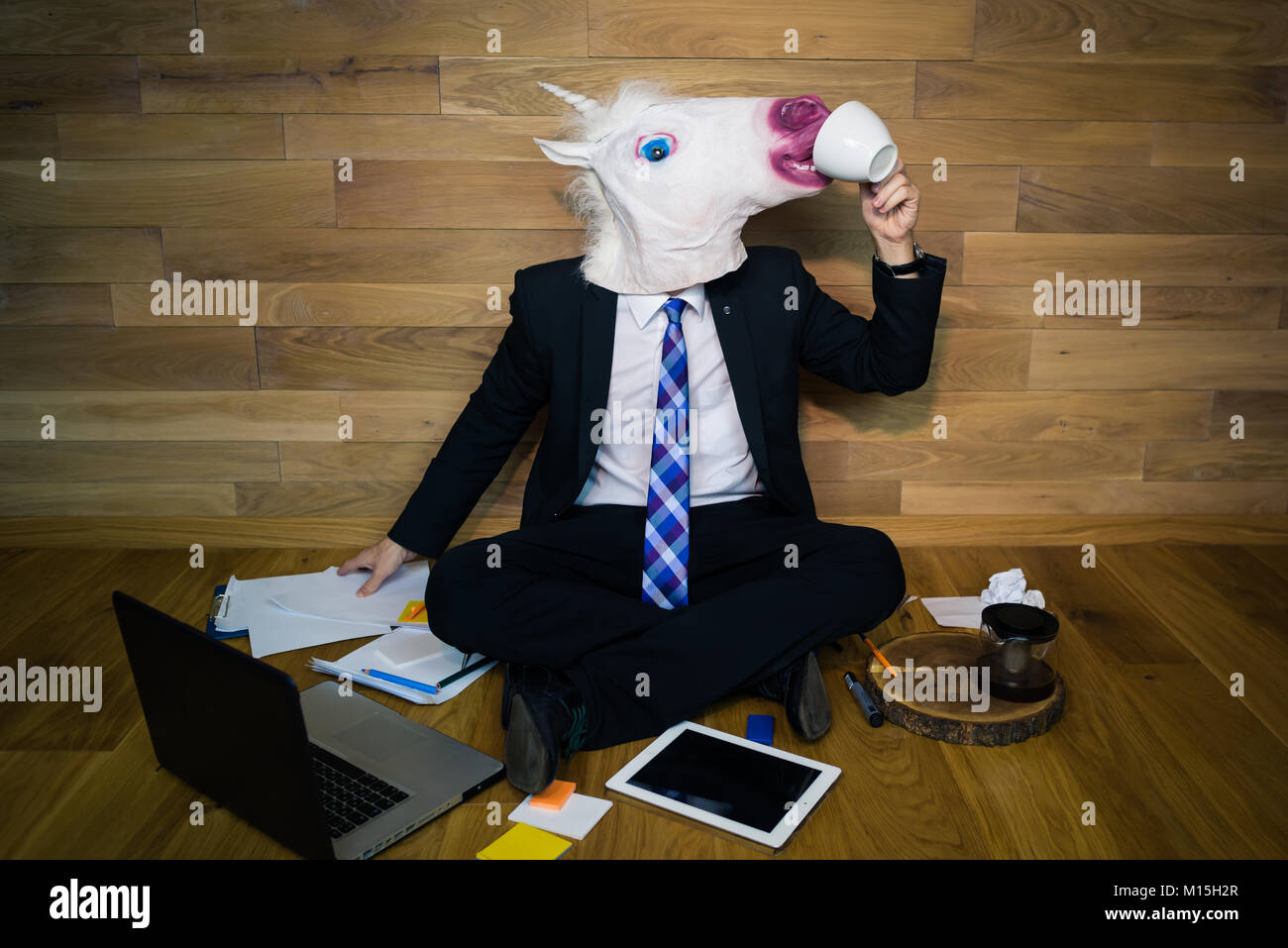 Young Man In Mask Drinking A Coffee Unicorn In A Suit And Tie