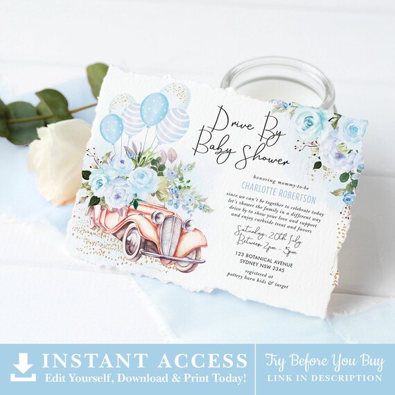 Editable Drive By Baby Shower Invitation Blue Floral Drive