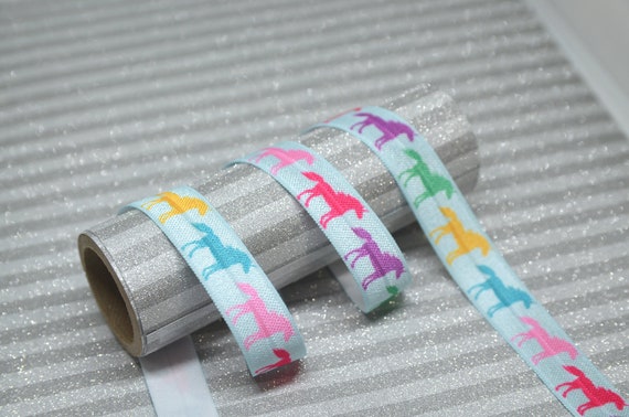 2 Yds 15mm Foil Fold Over Unicorn Printed Elastic Ribbon Diy