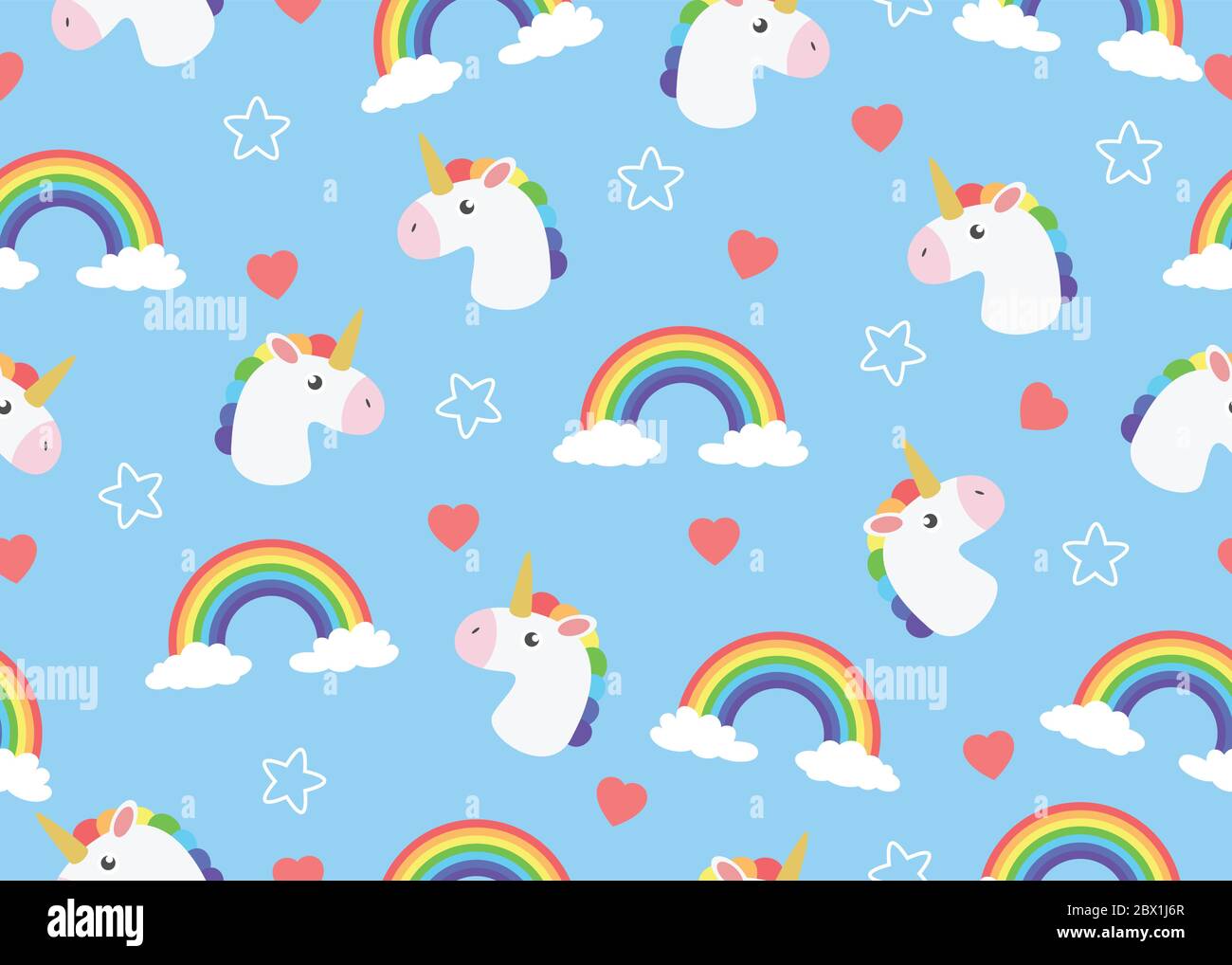 Seamless Pattern Of Cute Face Cartoon Unicorn With Clouds And