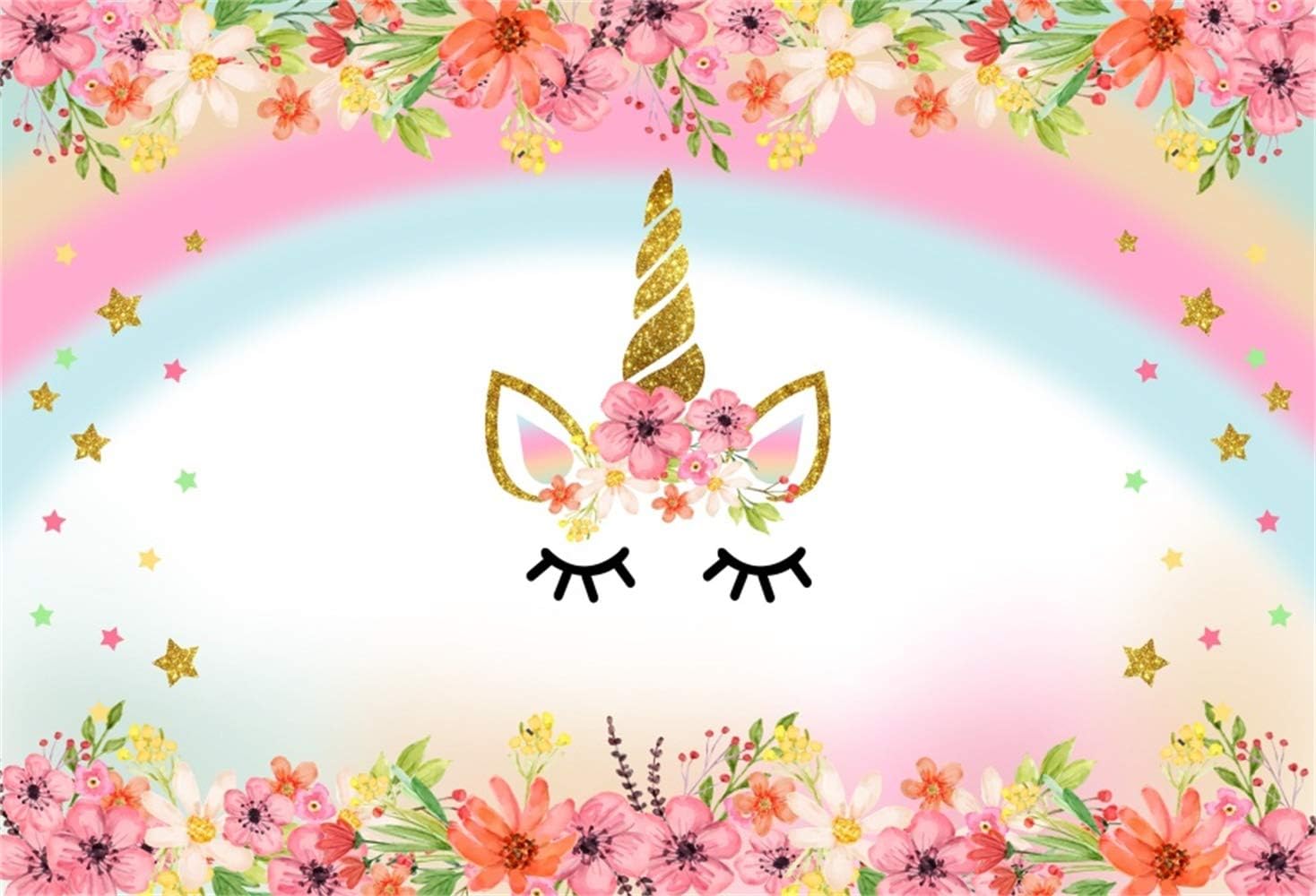 7x5ft Light Pink Floral Flowers Rainbow Gold Unicorn Horn Face