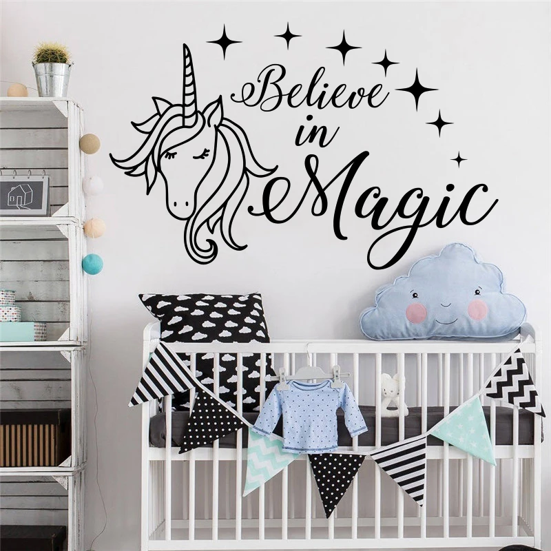 Face Unicorn Wall Stickers Quote Believe In Magic Pony Wall Art
