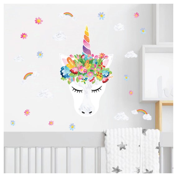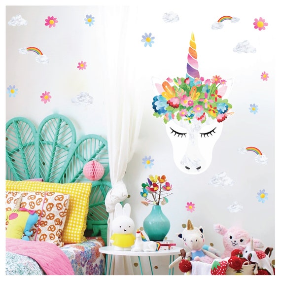 Rainbow Unicorn Face Wall Sticker With Clouds Flowers Etsy