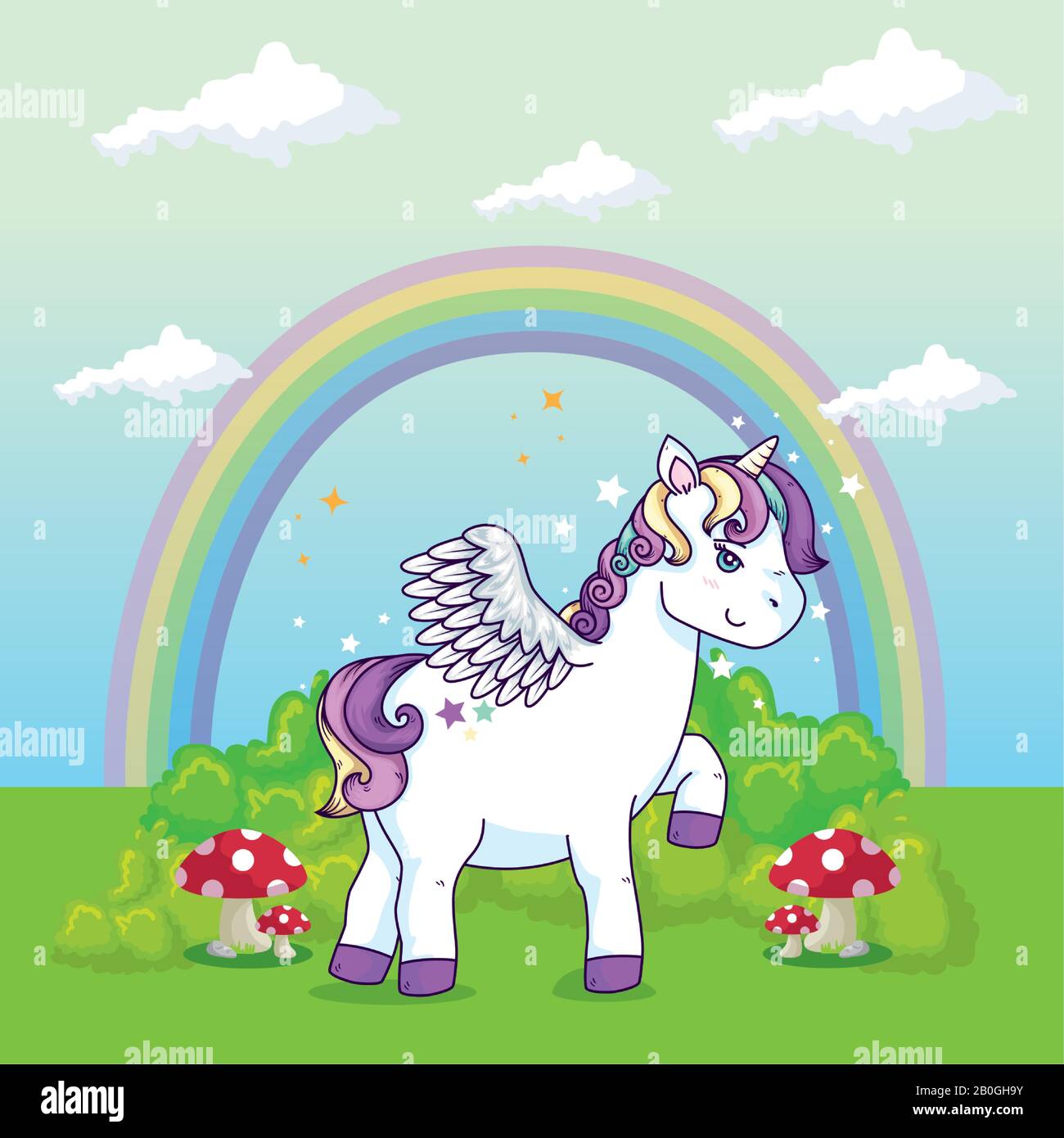Cute Unicorn Fantasy In Landscape With Rainbow Stock Vector Image
