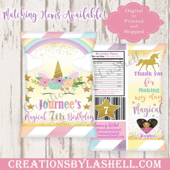 Printable Chip Bags Unicorn Rainbow Gold Pastel Theme Birthday