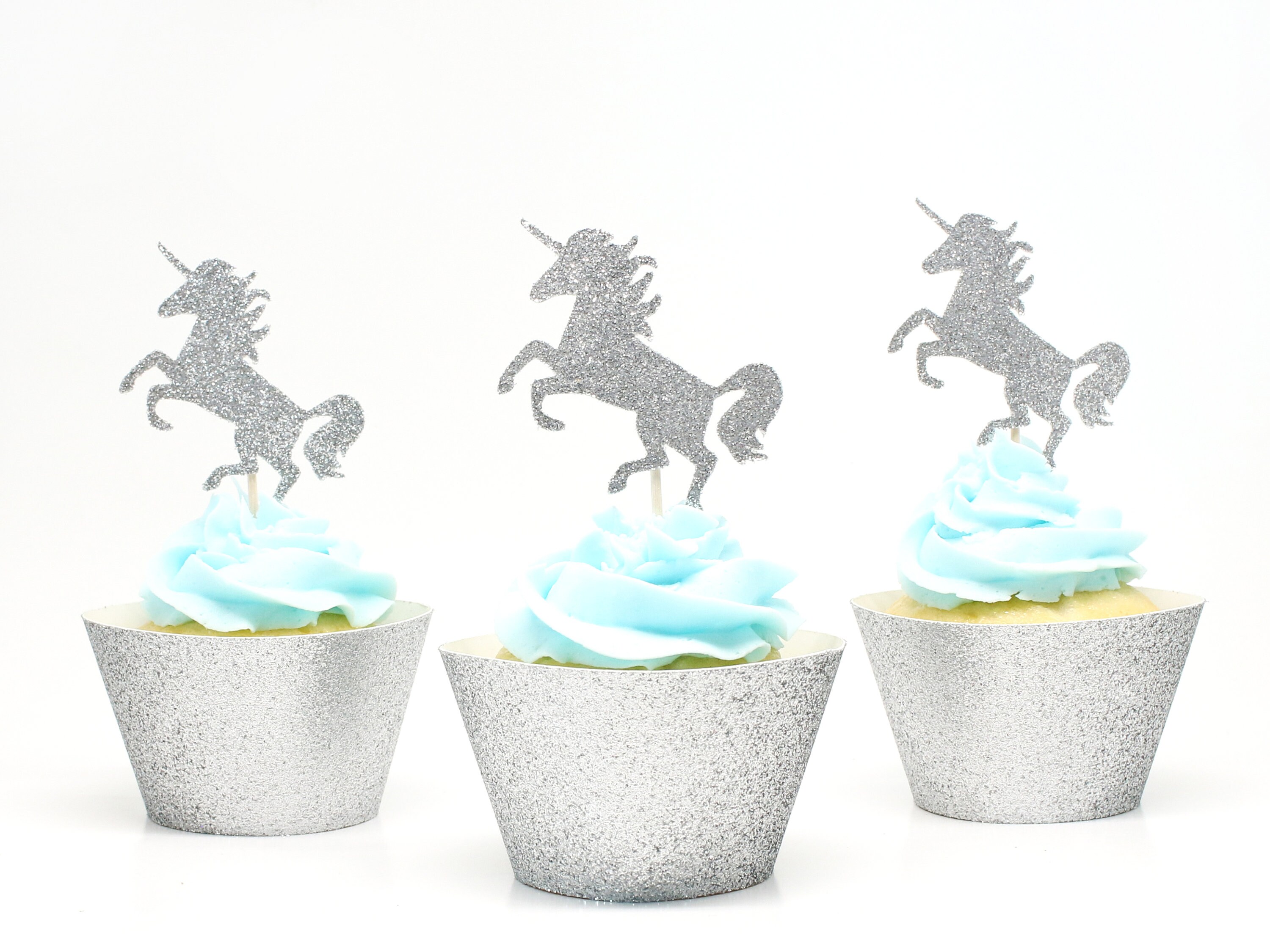 Unicorn Cupcake Toppers Silver Glitter First Birthday Decor
