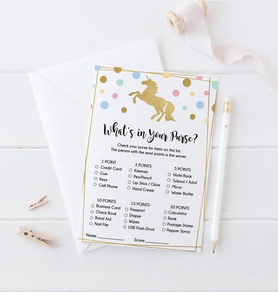 Unicorn What S In Your Purse Baby Shower Game Printable Unicorn