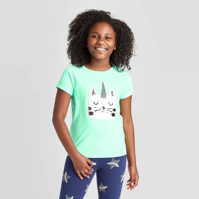 Girls Short Sleeve Unicorn Cat Flip Sequin T Shirt Cat Jack