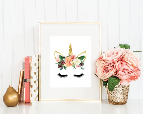 Gold Unicorn Flower Crown Nursery Girls Room Printable Wall Art