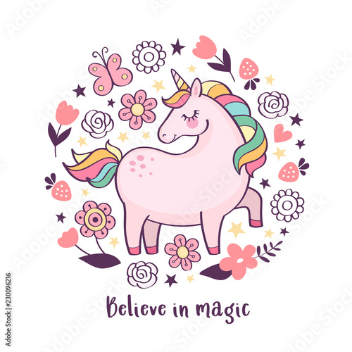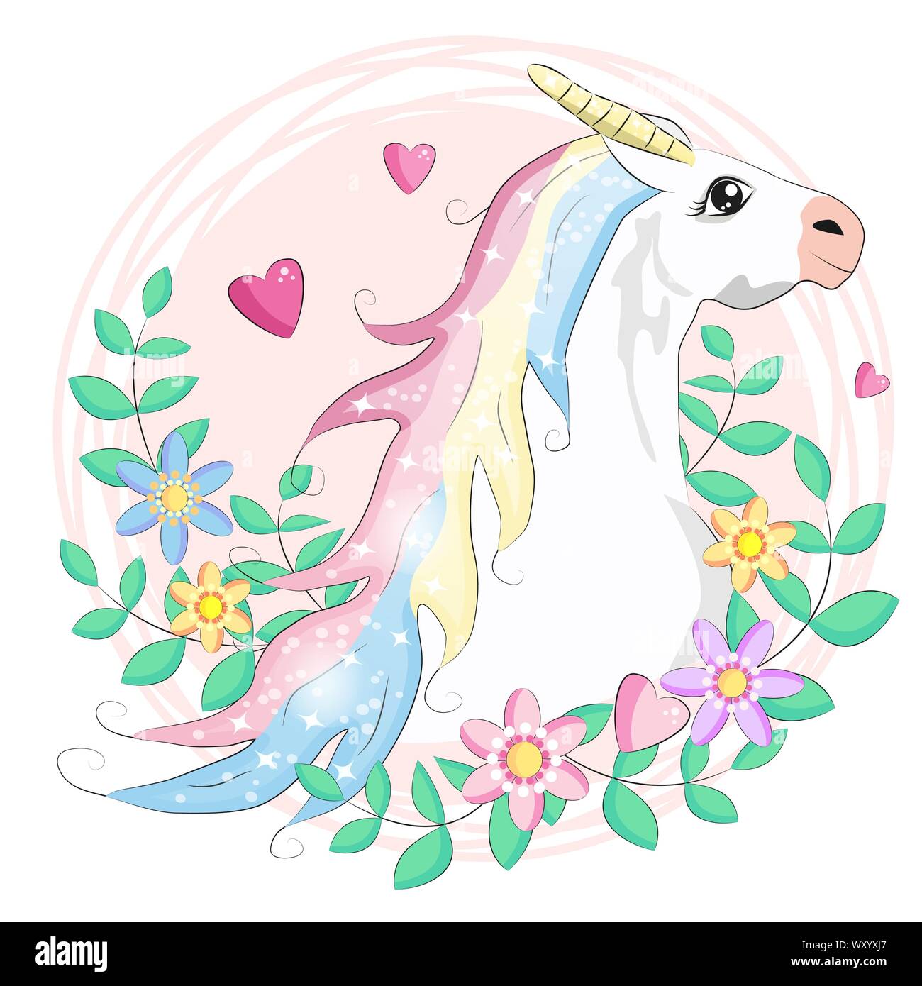 Cute Cartoon Unicorn With Flowers On A Pink Background Stock