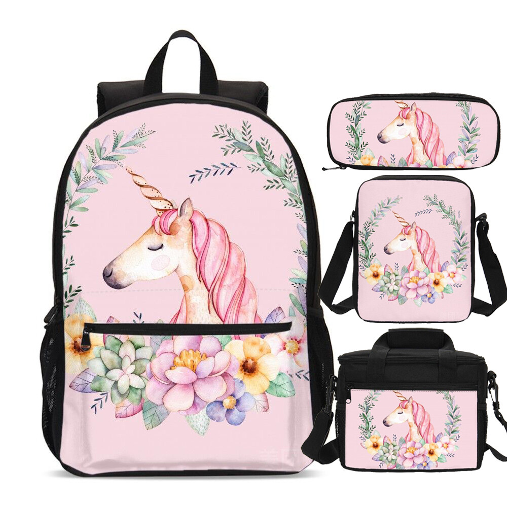 Pink Unicorn With Flower School Backpack Kids Girls Book Bag 4pcs