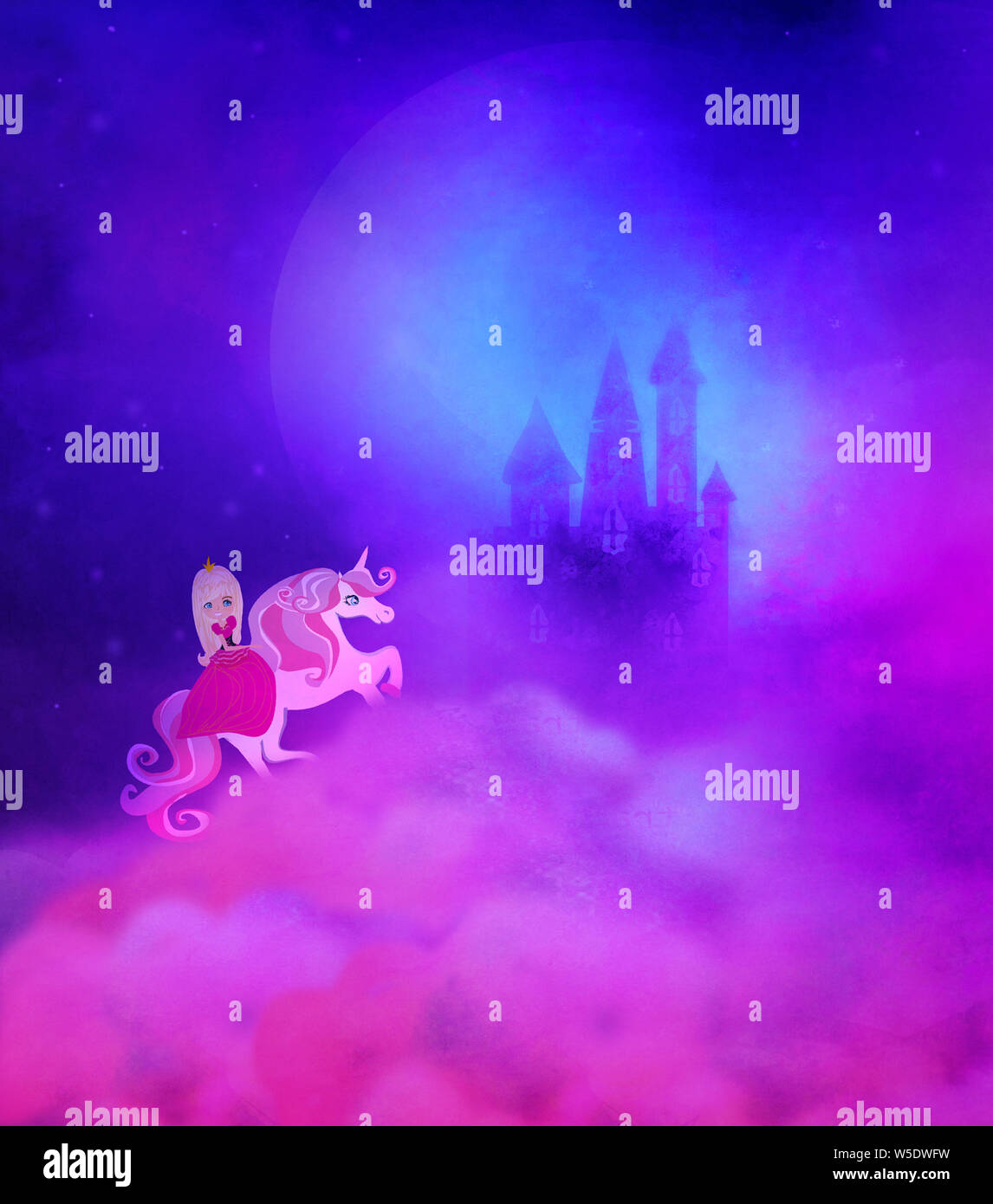 Girl On Unicorn Flying To The Magic Castle Stock Photo Alamy
