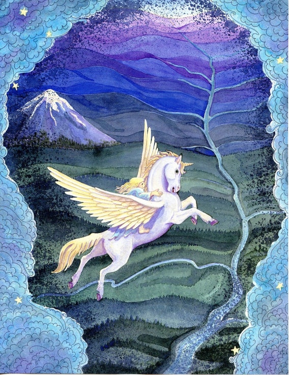 Unicorn Flying In The Sky Bookplate Art Print Illustrated By Etsy