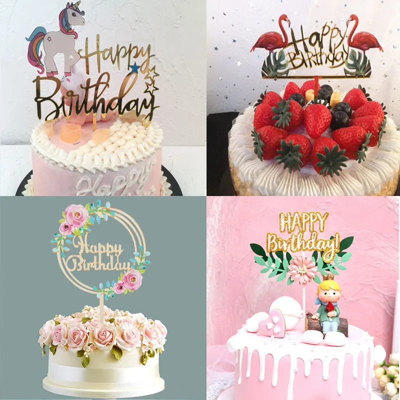 Gold Unicorn Acrylic Cake Toppers Flower Leaves Happy Birthday