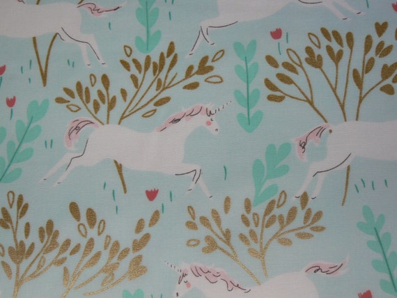 Fabric Unicorn Forest Aqua Metallic Gold X 30cm Ma Petite Mercerie