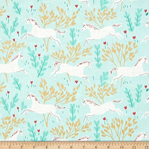 Magic Unicorn Forest Aqua Metallic Fabric By Michael Miller