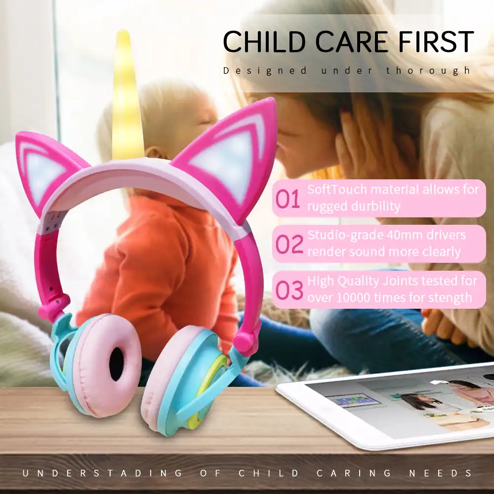 Glowing Unicorn Kids Headphones For Girls Boys Cat Ear Led