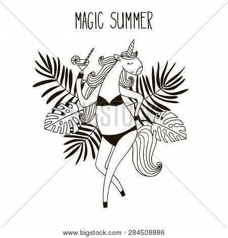 Cute Unicorn Girl In A Bathing Suit With A Glass Of Martini