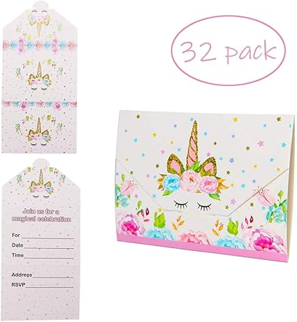 Amazon Com Unicorn Girls Party Invitations For Kids Birthday Baby Shower Unicorn Party Supplies Pink And Gold Envelopes Style Ready To Write Pack 32 Toys Games