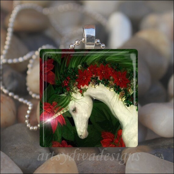Christmas Unicorn Holiday Fairy Tale Horse Glass Tile Pendant Etsy