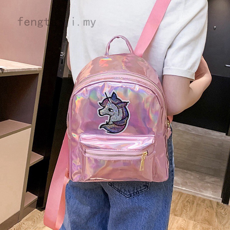Fengtaiji Girls Laser Unicorn Glitter Backpack Horse Ride School
