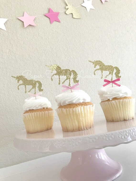 Unicorn Cupcake Toppers In Pink Ombre Gold Glitter Star Etsy