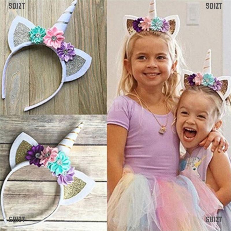 Kids Glitter Gold Unicorn Horn Ears Flower Headband Halloween