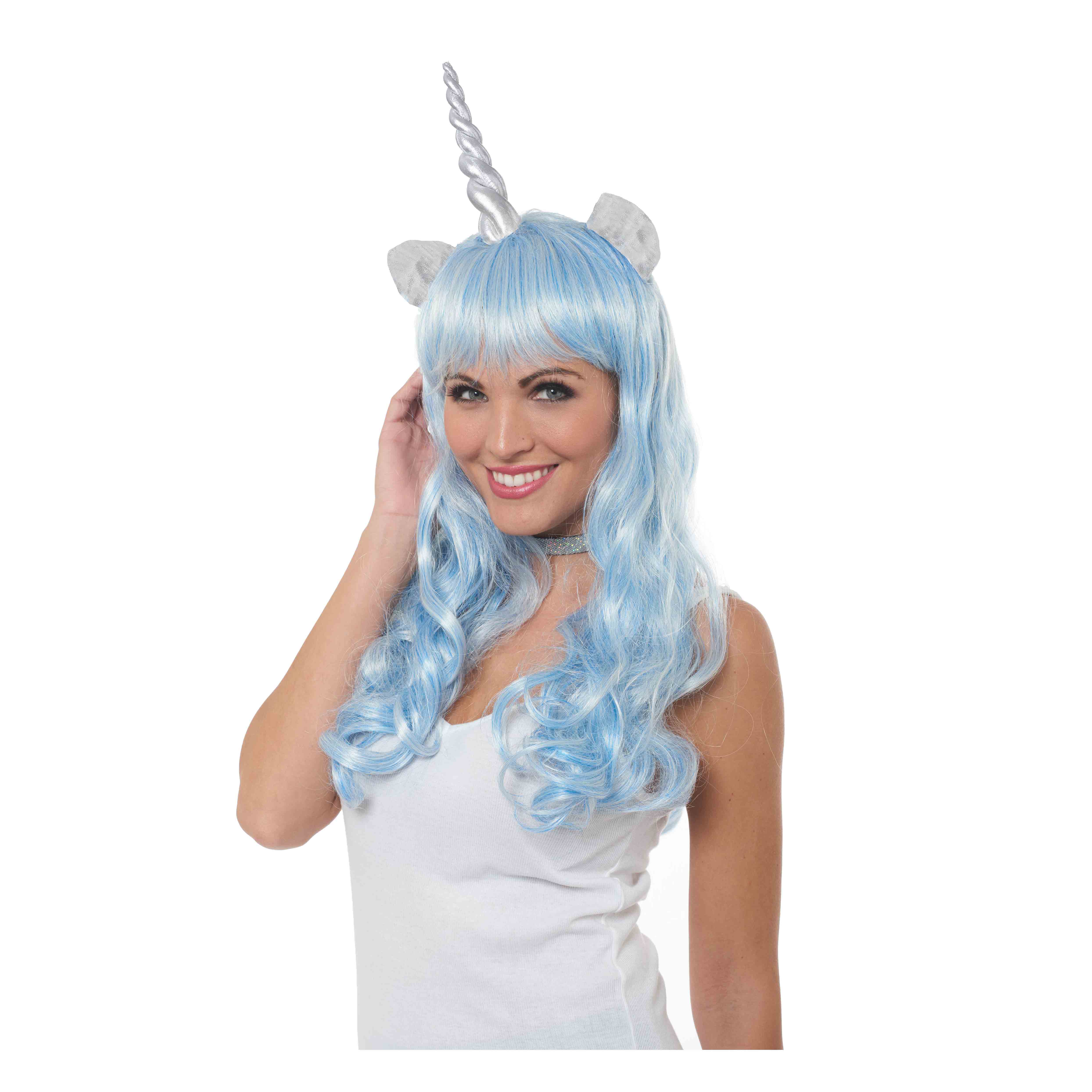 Womens Blue Silver Magical Unicorn Pony Horn Costume Long Wig Diy