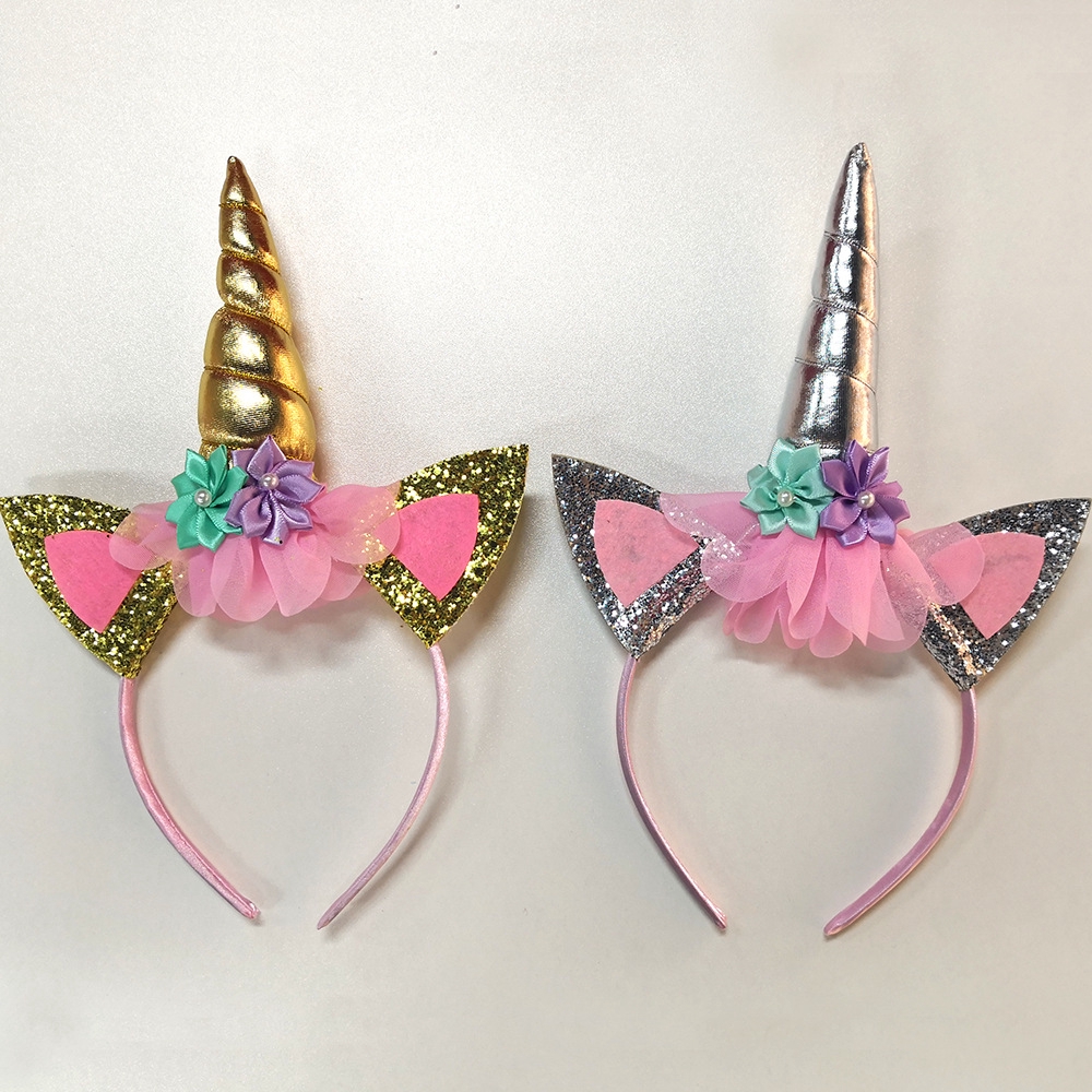 Unicorn Glitter Hair Hoop Gold Unicorn Horn Ears Flower Headband