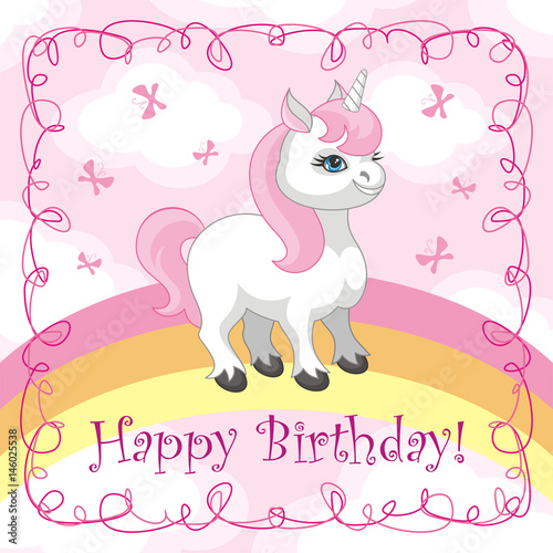 Happy Birthday Greeting Card With The Image Of Cute Unicorn