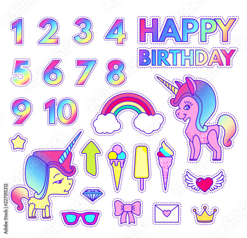 Happy Birthday Stickers Set With Digits Love And Unicorn Rainbow