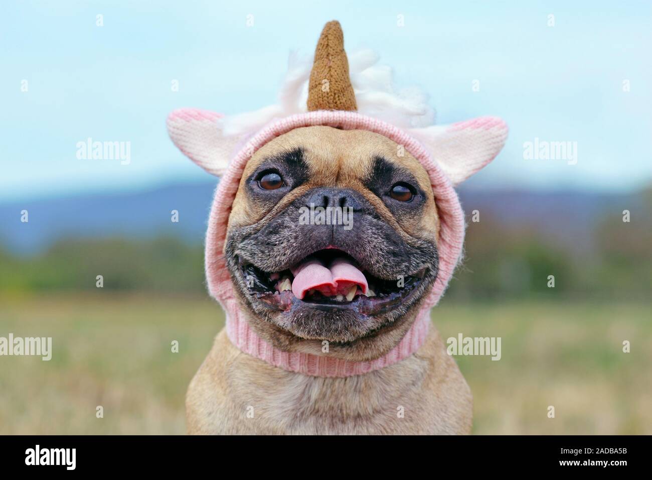 Lilac Brindle Colored French Bulldog Dog With Funny Pink Unicorn